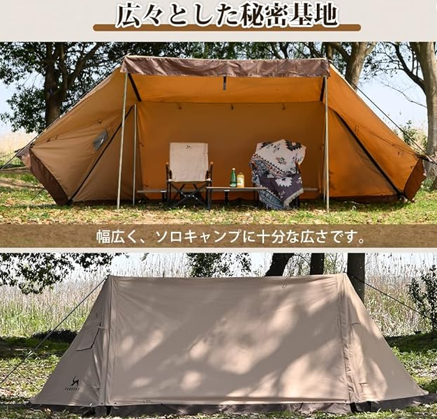 こちらのタイプは床部分の素材がないタープ型のテントですが、スペースが広く、前室も作れる(別売りポールを使用)ため雨天時も安心、なによりこじんまりしたシルエットでソロキャンプをひっそりを楽しみたい方に人気のタイプです。秘密基地風なので男性人気も高いです。