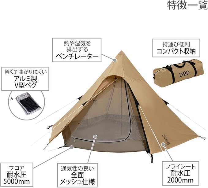 - テント:DOD ワンポールテントS(3.1kg / 約7,480円)